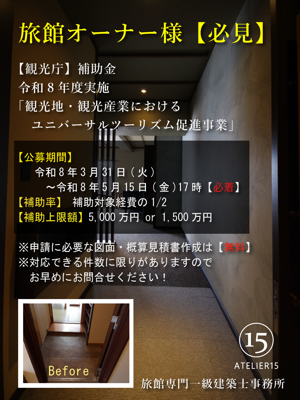 1期・2期・3期工事と、ご予算に合わせて理想の旅館に改修していくのが、この時代にあった堅実なやり方ではないでしょうか?